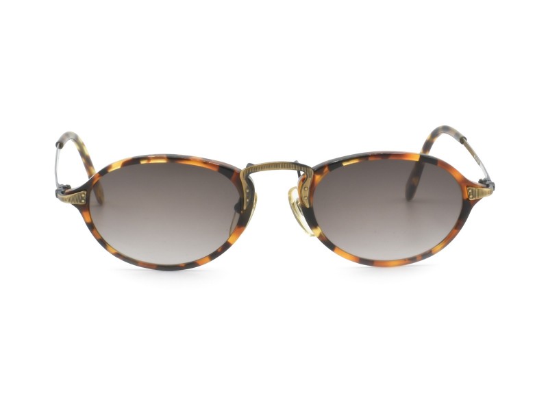 Occhiale realizzato in cello – metallo si contraddistingue con un ponte in metallo che funge da conduttore ai cerchi in celluloide trasparente della montatura.